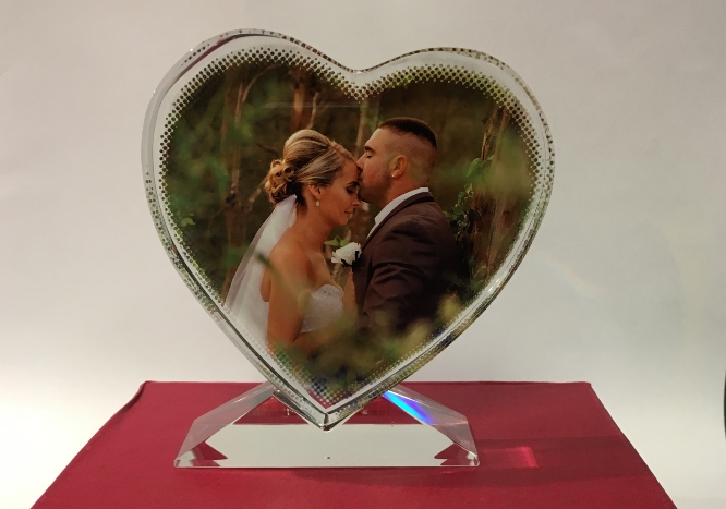 Szublimációs bevonattal ellátott, szív alakú üveg „kristálytömb”.