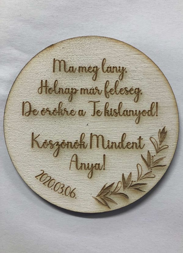 Formára vágott falemezbe gravírozzuk az általatok kért szöveget vagy grafikát saját terveitek alapján. Fa hűtőmágneseink is szinte végtelen módon alakíthatóak, igény szerint fotóval is kérhetőek.